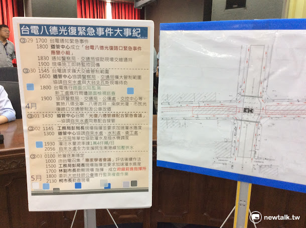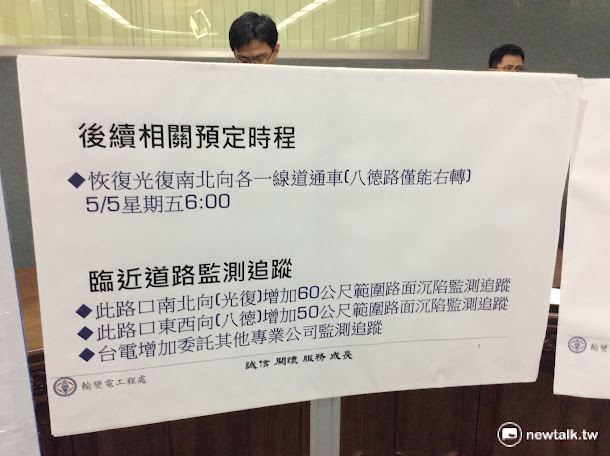 依據台電與台北市政府的估計,該路口在5月5日上午將進行單線道初步通車,並且須等到5月19日凌晨才能開放完全通車;地底潛盾機的救援工作,必須等到7月29日由專家研擬救援方案。 圖:程士華/攝